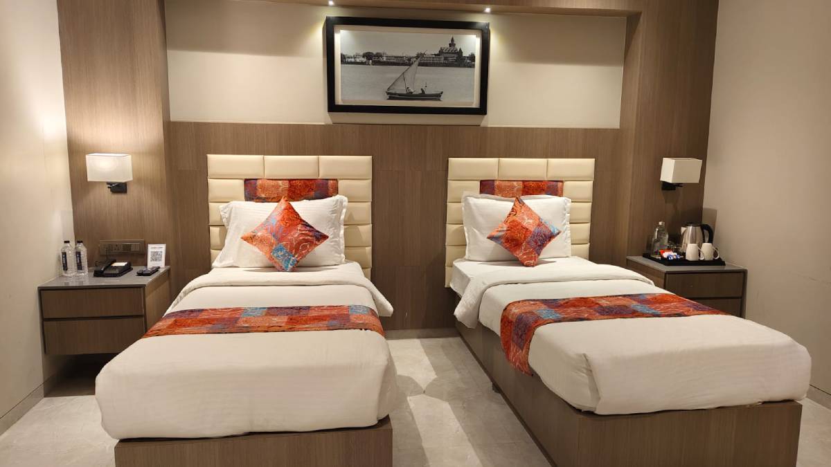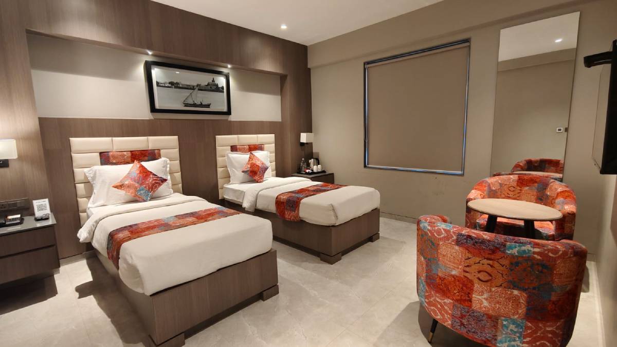 The Super Deluxe Twin Bed Room at La Casa De Rann offers a comfortable and well-designed space, featuring twin beds, stylish interiors, a private modern bathroom, and a flat-screen TV. Perfect for friends or solo travelers, it includes air conditioning, complimentary water, and peaceful surroundings for a relaxing stay in Bhuj.