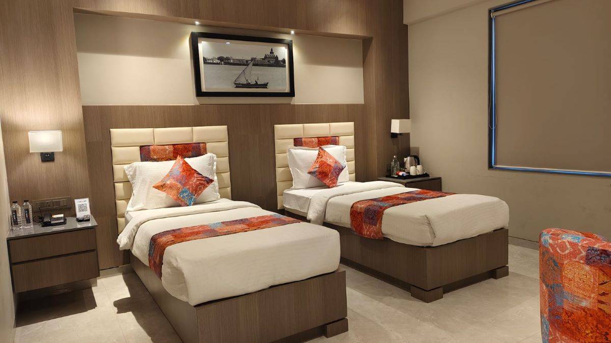 The Super Deluxe Twin Bed Room at La Casa De Rann offers a comfortable and well-designed space, featuring twin beds, stylish interiors, a private modern bathroom, and a flat-screen TV. Perfect for friends or solo travelers, it includes air conditioning, complimentary water, and peaceful surroundings for a relaxing stay in Bhuj.